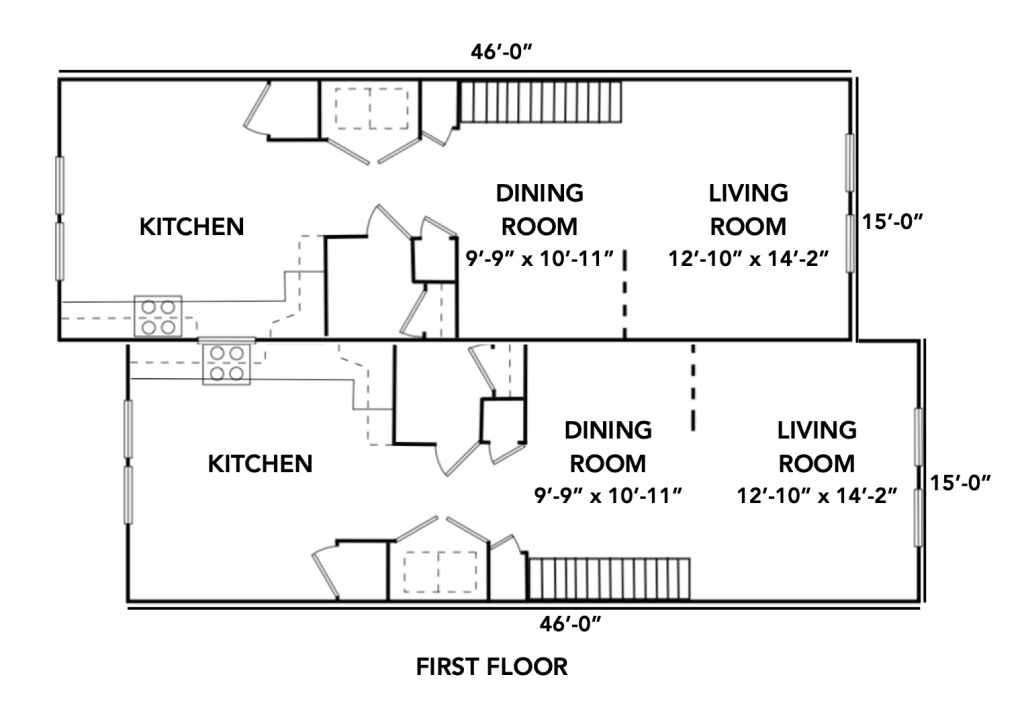 This duplex includes two units, each exceeding 1,300 square feet of living space with a layout well-tailored to many urban areas, particularly in the midwest. The kitchen, dining room and living room are located on the first floor with a half bath, while the second floor includes a primary bedroom with en suite bath, along with two additional bedrooms and a full bath.