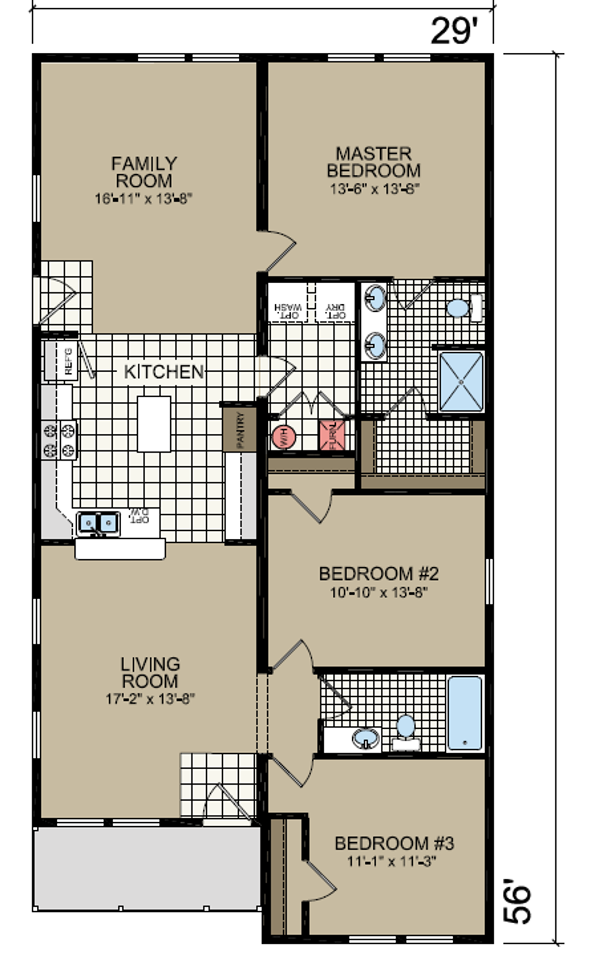 With three bedrooms and two bathrooms and nearly 1,600 square feet of space, the Sparrow is our take on traditional family living. Enter through the living room and enjoy a thoughtfully paired kitchen and dining room. The public areas of The Sparrow are intentionally separated from bedrooms and baths to create zones of community and areas of privacy. Variations on this floor plan can facilitate ADA and other accessibility-oriented features.